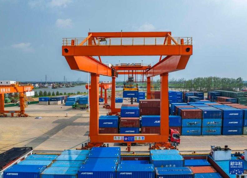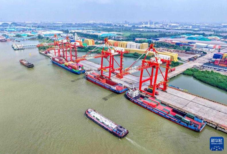 7月13日,貨船在江蘇省興化經(jīng)濟開發(fā)區(qū)的(中交)興化港口泊位上裝卸集裝箱(無人機照片)。