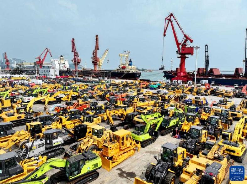 7月13日,在江蘇省連云港港東方港務(wù)分公司碼頭,大批出口機械集港等待裝船(無人機照片)。