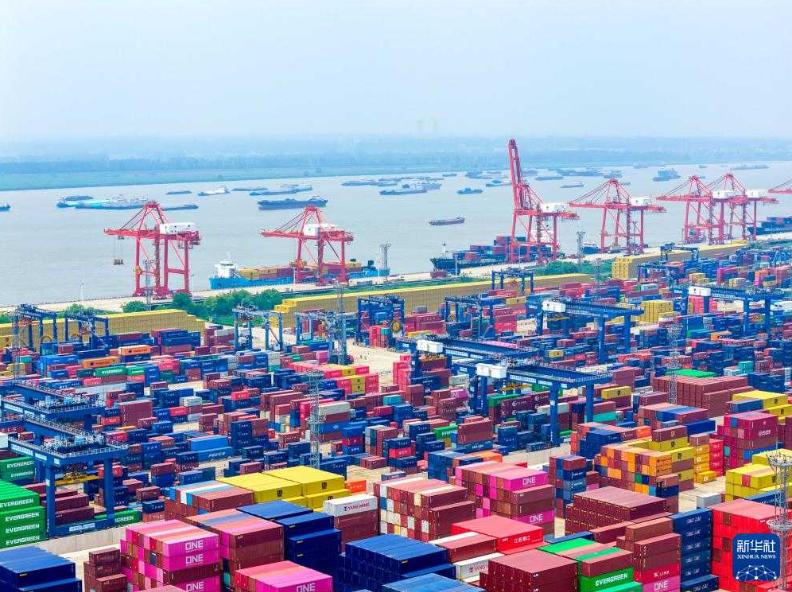 這是在江蘇南京龍?zhí)陡奂b箱碼頭拍攝的等待裝船的集裝箱(7月10日攝,無人機照片)。