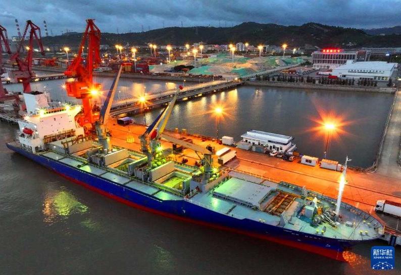 7月9日晚上,一艘載有5000余噸獼猴桃的新西蘭貨輪順利停泊在浙江省玉環(huán)市大麥嶼港,機械卸載貨物(無人機照片)。